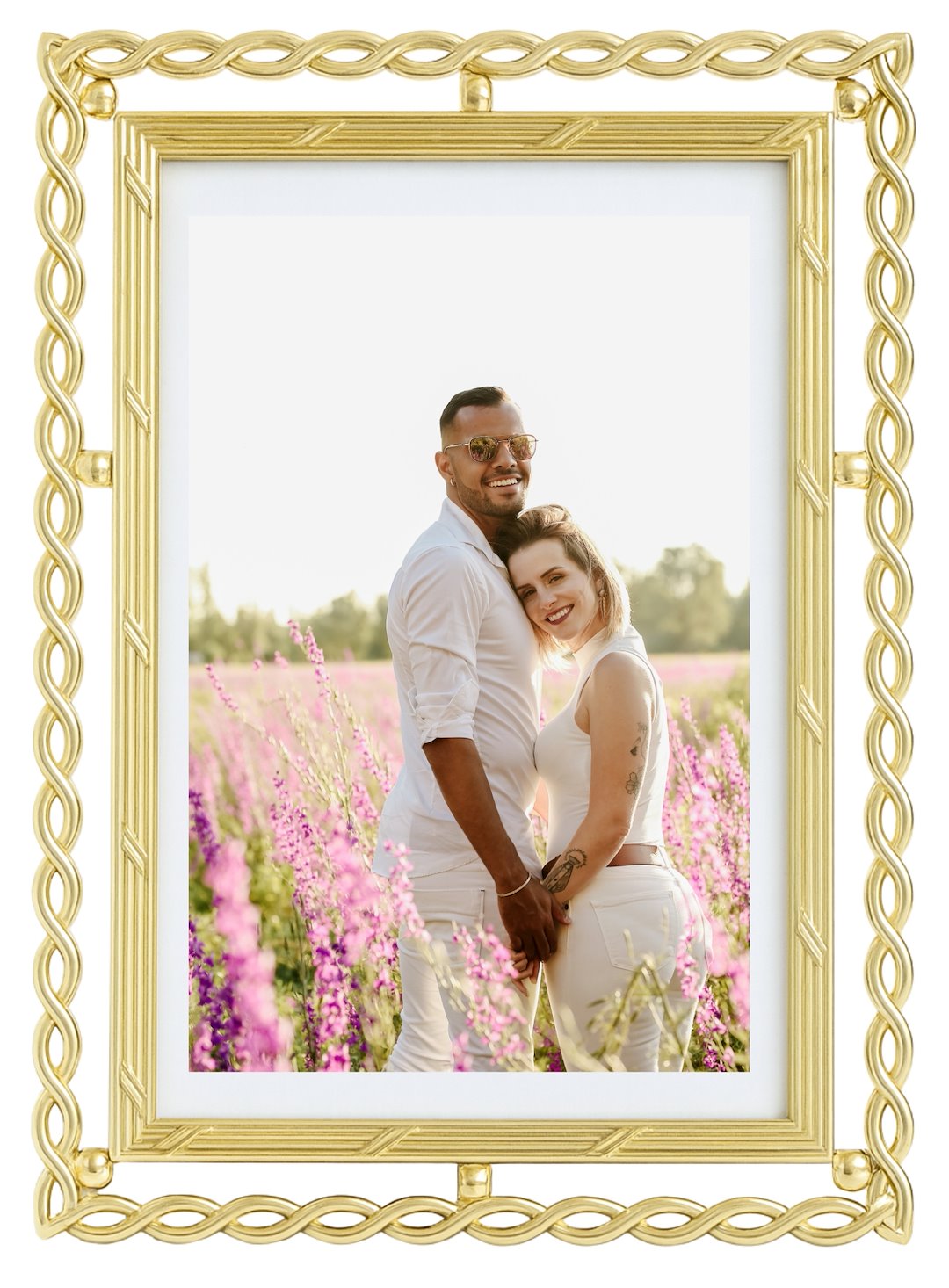 Ramka wyróżnia się misternie wykonanym, ażurowym wzorem inspirowanym plecionym sznurem, który zdobi jej zewnętrzne krawędzie. Wewnętrzna część ramy posiada subtelne, pionowe żłobienia, tworząc ciekawy kontrast faktur. Całość utrzymana jest w eleganckim, złotym kolorze o satynowym wykończeniu, dzięki czemu pasuje zarówno do wnętrz w stylu glamour, jak i klasycznym.