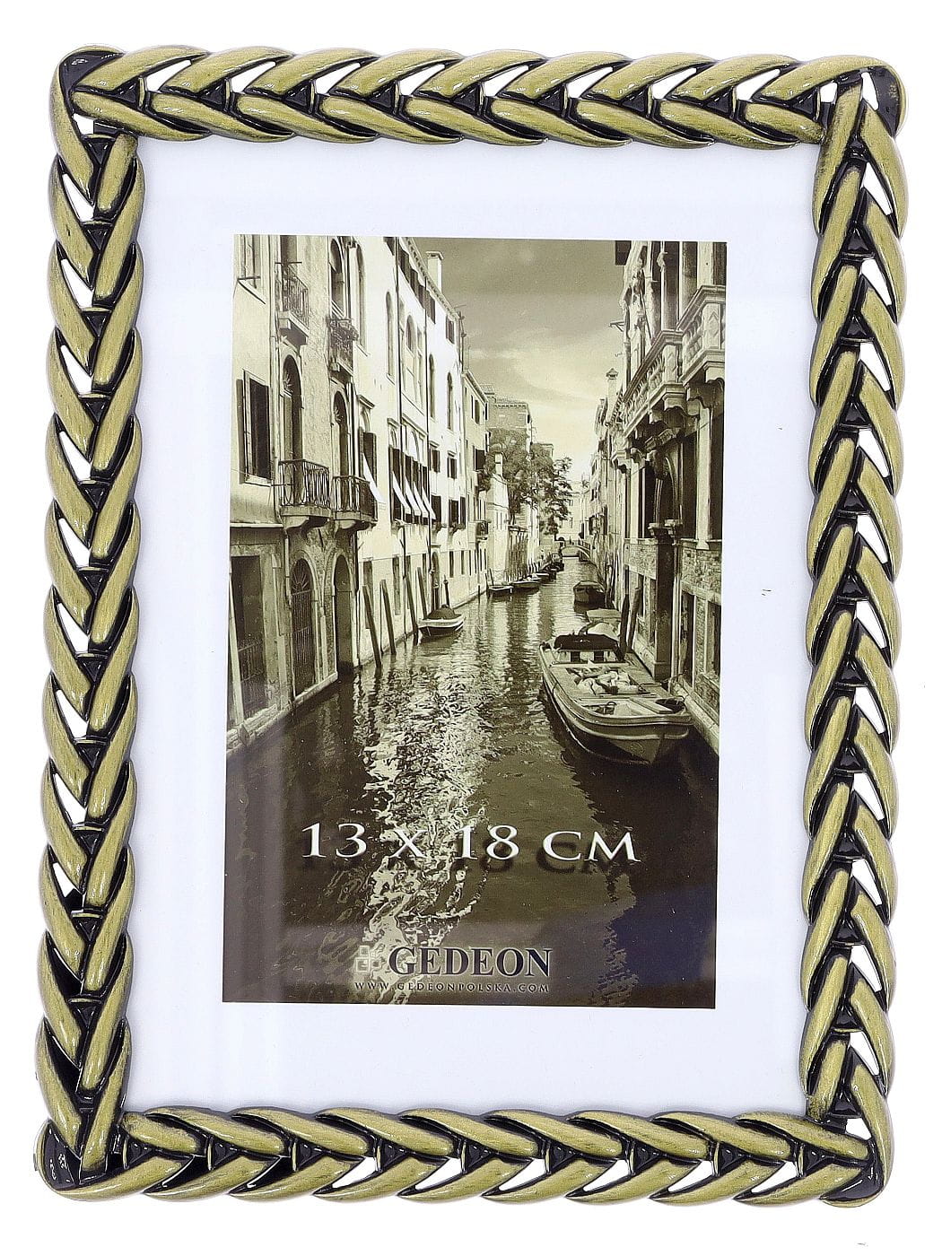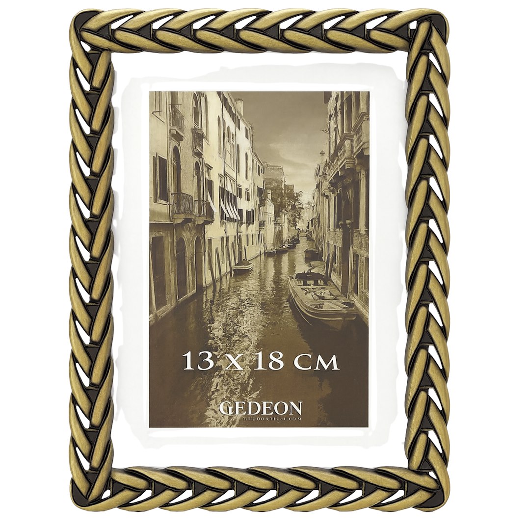 Prezentujemy metalową ramkę na zdjęcia, która sama w sobie stanowi element dekoracyjny. Jej charakterystyczną cechą jest szeroki, przestrzenny profil o fakturze przypominającej pleciony warkocz. Połączenie koloru starego złota z czarnymi, patynowanymi akcentami nadaje jej unikalnego, nieco postarzanego charakteru, który doskonale wpisuje się zarówno w klasyczne, jak i nowoczesne wnętrza.