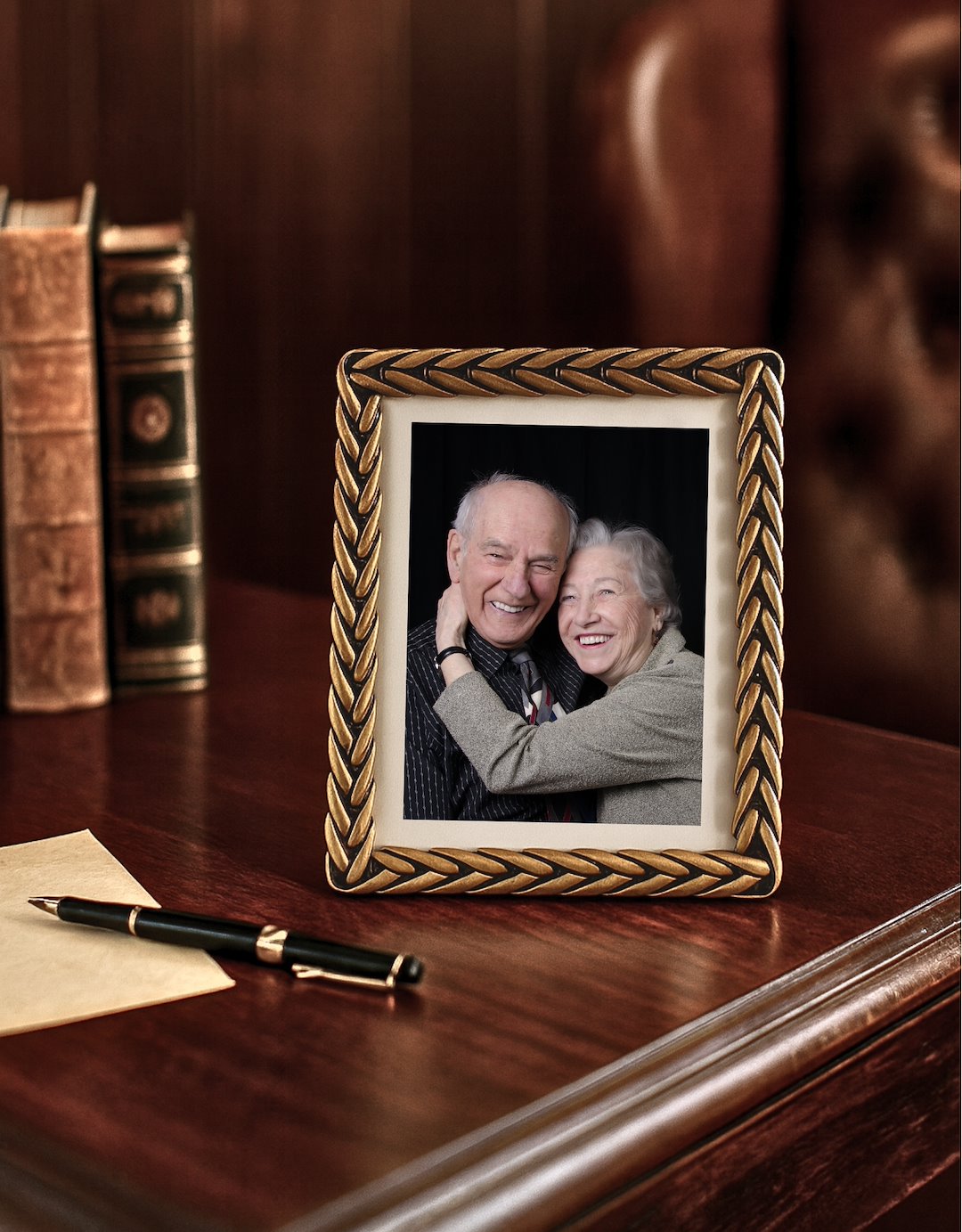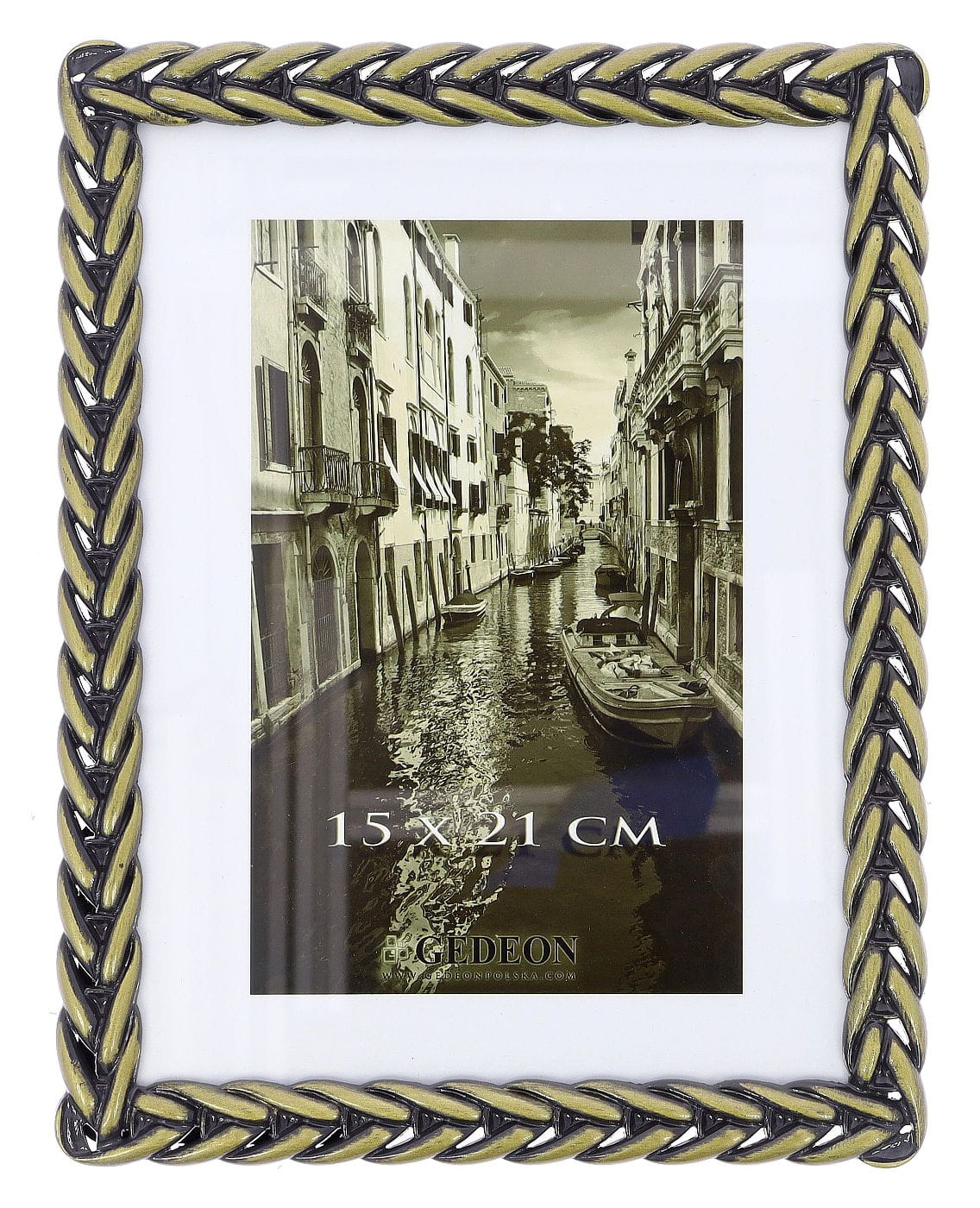 Ramka została wykonana z wysokiej jakości metalu, co gwarantuje jej trwałość i stabilność. Uwagę przyciąga przede wszystkim jej trójwymiarowa struktura, stylizowana na gruby, pleciony warkocz. Wykończenie w kolorze postarzanego złota z czarnymi przetarciami nadaje jej szlachetnego, nieco industrialnego wyglądu. To połączenie sprawia, że ramka doskonale wpisze się zarówno w nowoczesne, jak i klasycznie urządzone przestrzenie.