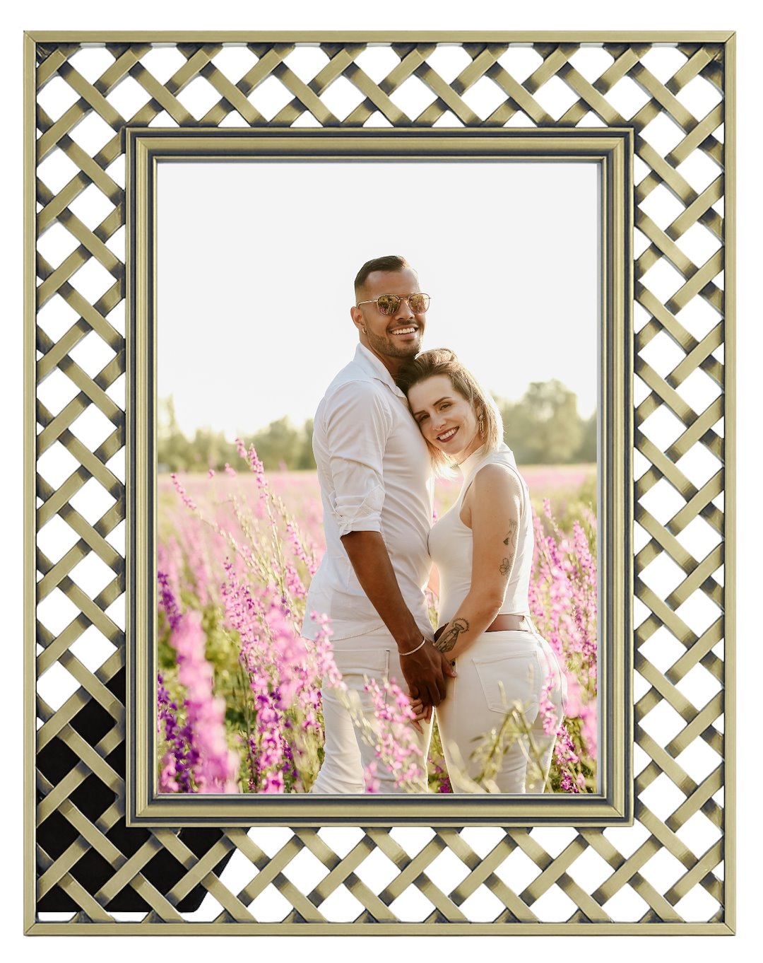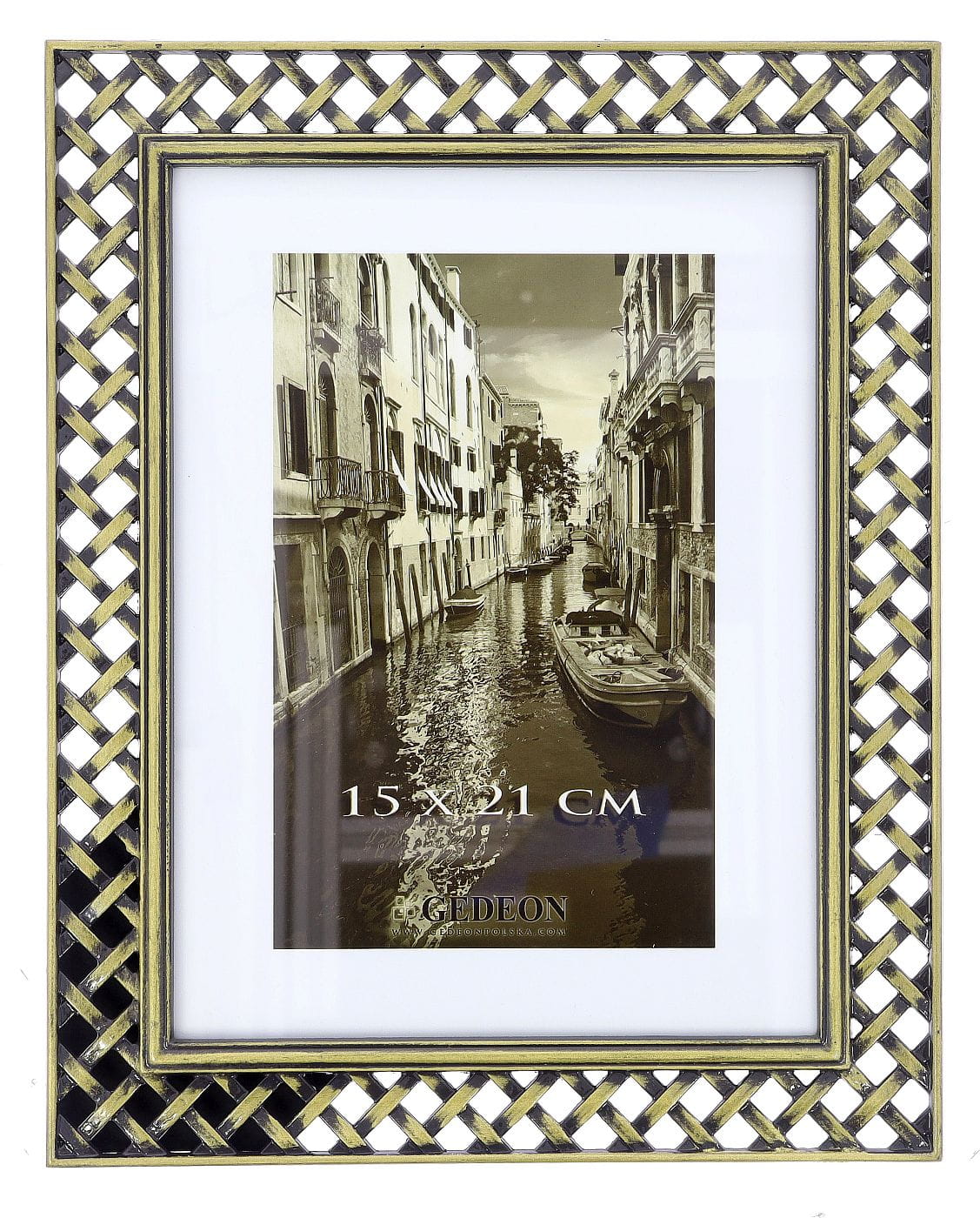 Prezentowany model to więcej niż zwykła ramka – to element dekoracyjny, który przyciąga wzrok. Wykonana z wysokiej jakości metalu, gwarantuje trwałość i stabilność. Jej najbardziej charakterystycznym elementem jest szeroka, przestrzenna rama o ażurowym wzorze plecionej kratownicy, która nadaje jej trójwymiarowy i dynamiczny charakter.