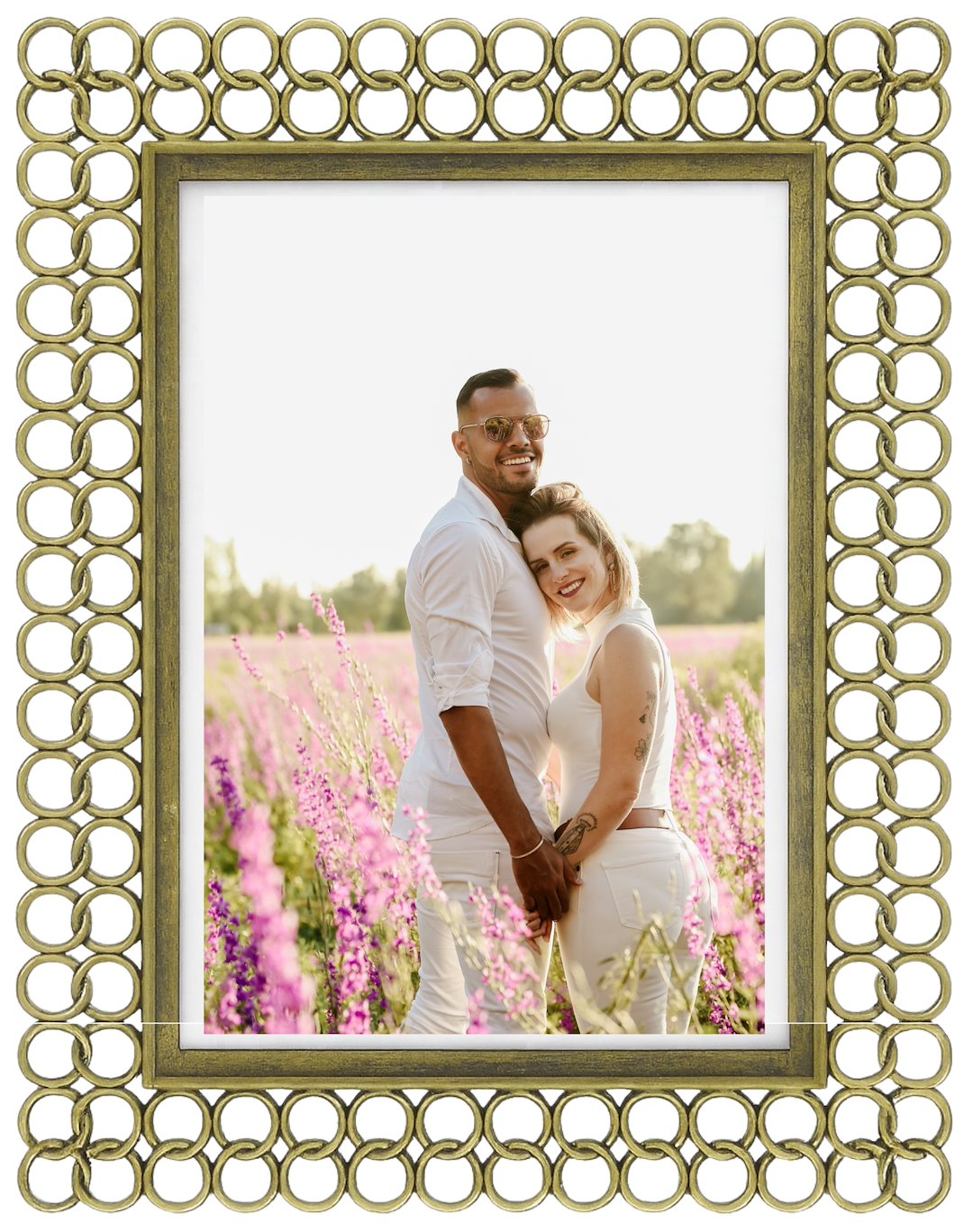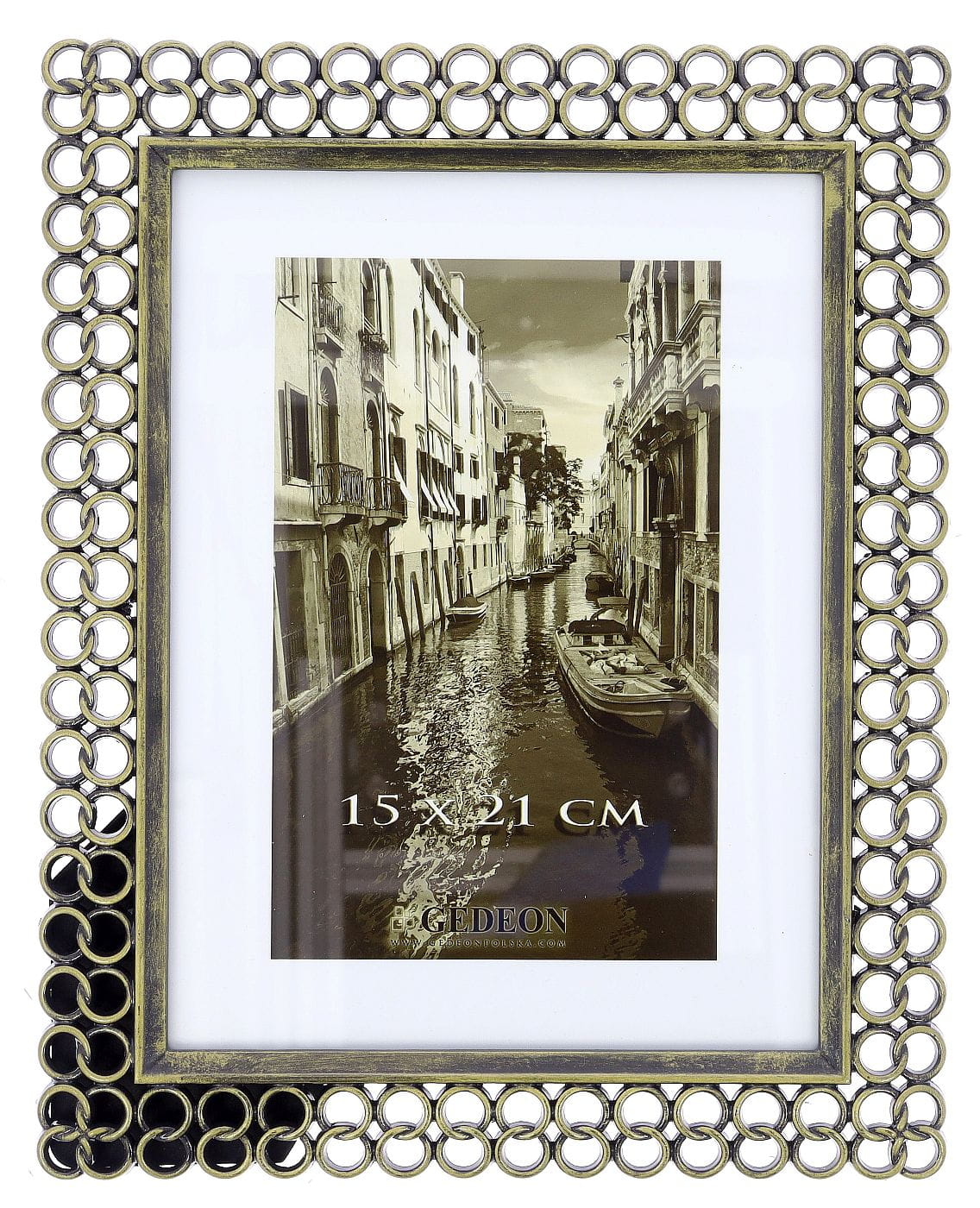 Ramka została wykonana z wysokiej jakości metalu, wykończonego w odcieniu antycznego, lekko patynowanego złota. Jej najbardziej charakterystycznym elementem jest szeroka, ażurowa rama o wzorze przypominającym splot z połączonych ze sobą kółek lub ogniw. Ta trójwymiarowa struktura tworzy interesującą grę światła i cienia, dodając zdjęciu głębi.