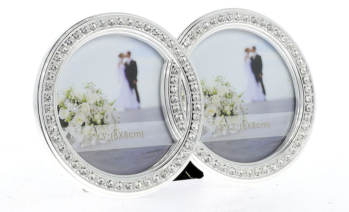 Ramka została wykonana z wysokiej jakości metalu o polerowanym, srebrnym wykończeniu. Jej głównym atutem jest precyzyjnie osadzony rząd bezbarwnych, fasetowanych kryształków, które otaczają każde ze zdjęć, dodając im subtelnego luksusu i pięknie odbijając światło. Gładka, zaokrąglona powierzchnia ramki jest przyjemna w dotyku i łatwa w czyszczeniu.
